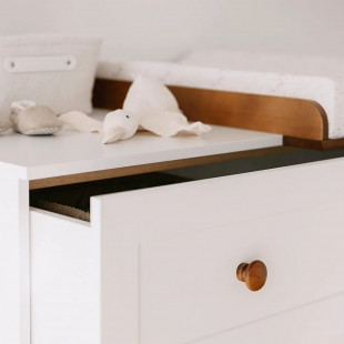 Le plan à langer en bois, assorti à la finition vintage, peut être installé à droite, au centre ou à gauche du plateau selon l’agencement souhaité. Entièrement amovible, il se démonte facilement lorsque l’enfant grandit. Une fois retiré, le plateau supérieur reste parfaitement lisse, sans aucune trace visible de fixation, permettant d’utiliser la commode comme un meuble classique.