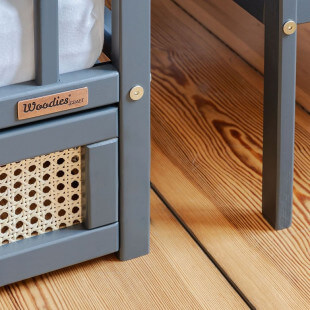 Le lit se distingue par la finition en rotin du tiroir, cela lui donne un caractère confortable et moderne à la fois. Le tiroir est indépendant, sur roulettes et avec un couvercle.