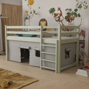 Le lit mezzanine avec rideau JACK séduit par son design élégant et sa conception intelligente, parfaitement adaptée aux jeunes enfants. Sa structure entièrement réalisée en bois massif de pin garantit stabilité et sécurité, tandis que les barrières assurent des nuits paisibles. Sous le couchage, l'espace se transforme en véritable cabane avec rideau, idéale pour s'imaginer en pirate et vivre mille aventures. Ce coin ludique peut aussi servir d'espace de jeu, de rangement ou de refuge cosy selon les envies. Fonctionnel et créatif ce lit optimise l'espace tout en stimulant l'imagination des enfants.