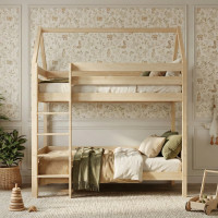 Le lit superposé en bois DOMEK 2 offre deux espaces de couchage en forme de petite maison, alliant fonctionnalité et imagination enfantine.