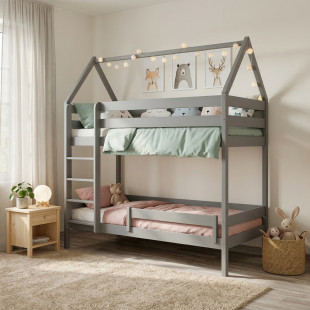 Le lit superposé en bois DOMEK 2 offre deux espaces de couchage en forme de petite maison, alliant fonctionnalité et imagination enfantine.