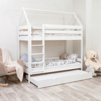 Le lit superposé en bois DOMEK 3 offre trois espaces de sommeil astucieusement intégrés dans une structure en forme de petite maison, mêlant fonctionnalité et imagination enfantine.