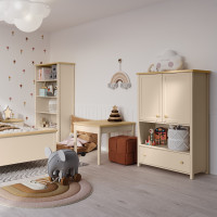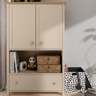 Elle est séparée en trois parties : 2 portes pour la partie supérieure, ensuite vient une large niche au niveau central du mobilier. Et enfin, un grand tiroir vient se greffer à la partie inférieure du meuble. Cette commode est un indispensable pour ranger des habits, des jouets, des livres, des cadres photo dans la niche.