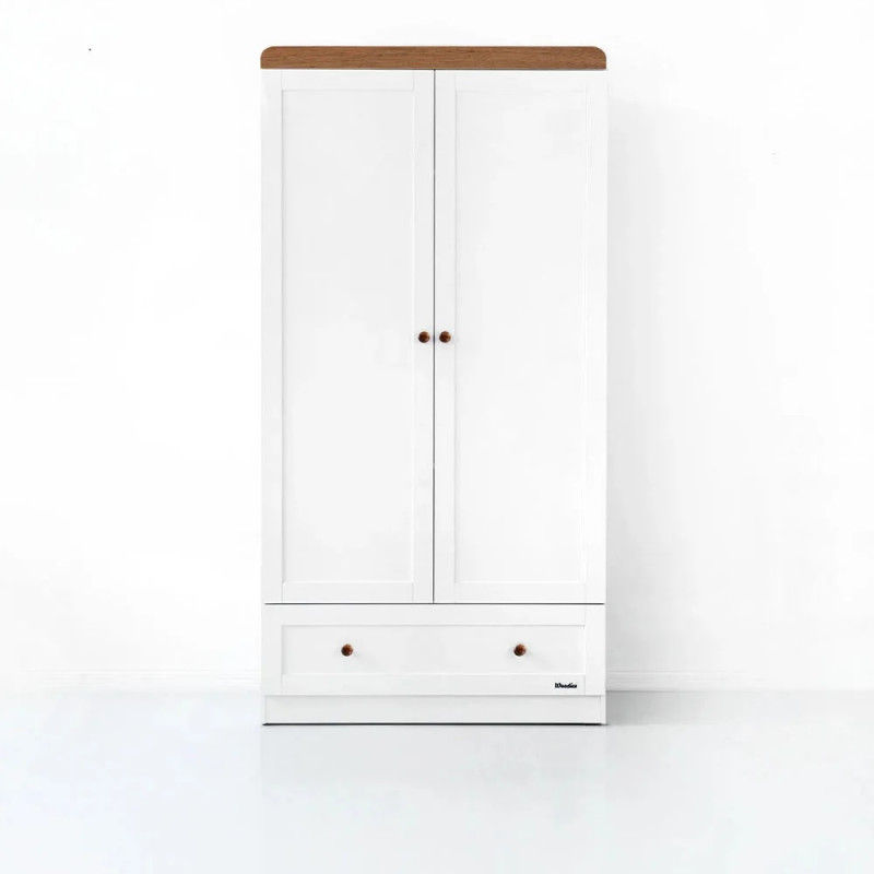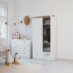 Avec son design intemporel, cette armoire s’intègre harmonieusement dans une chambre de bébé, aux côtés du lit et de la commode. Son coloris blanc semi mat, subtilement rehaussé d’éléments finition vintage, apporte douceur et luminosité sans alourdir visuellement l’espace. Elle convient aussi bien aux petites qu’aux grandes pièces et s’accorde facilement avec différents styles, couleurs et motifs.